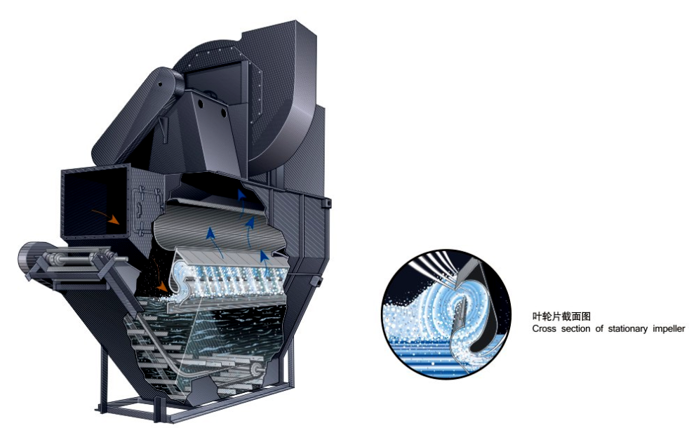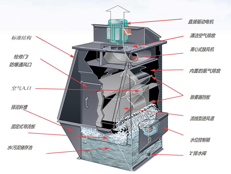 RCN濕式国产麻豆精品,利用高壓風機引流水花造浪,鼓浪洗滌粉塵,不用濾料,不用水泵,不用噴頭,汙泥通過拉鏈機刮泥裝置排出。
