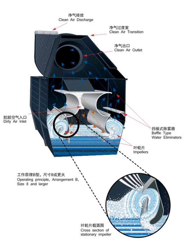 (2)靈活性:如需要調整收塵效率,可通過調整水位,同時相應調整排氣風機的規格,就可以使收塵效率增加或者降低。精心設計的葉輪片可產生較高的壓降和較高的氣流速度來增加收塵效率。