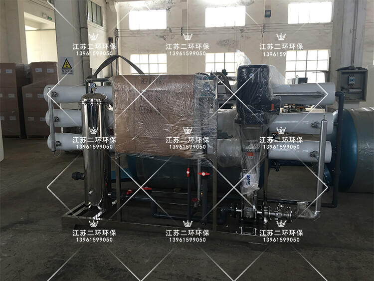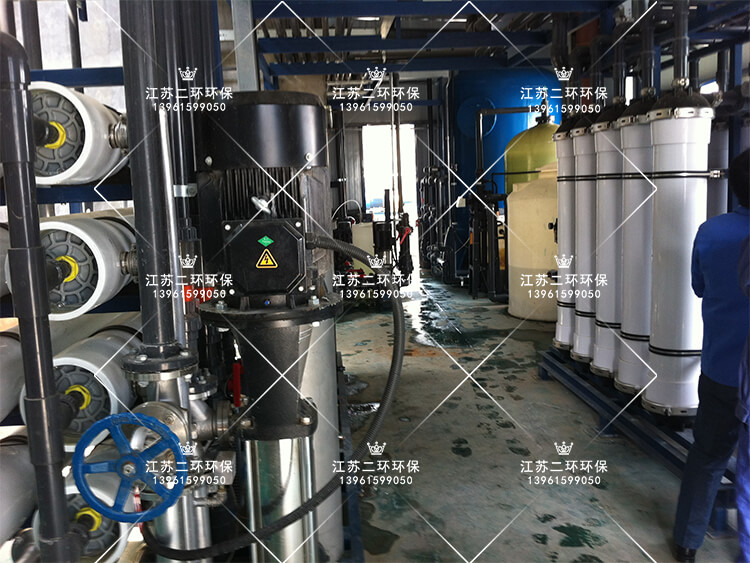 清水池→引水器→中水泵→機械過濾器(絮凝劑加藥)→活性炭過濾器(阻垢劑加藥)→增壓泵→布袋過濾器→超濾裝置→超濾水箱→超濾水箱→超濾水泵→保安過濾器→還原阻垢加藥係統→反滲透裝置→淡水箱、濃水箱(濃水處理係統)