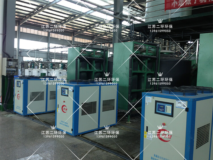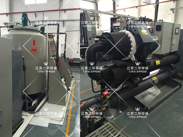 利用風冷式冷凍機或螺杆水冷機冷凍製冷,冷凍機自身帶有高效熱交換器,冷凍壓縮機製冷傳導給冷凍劑R22(乙二醇),溫度保持在-10攝氏度以上,形成冷凍水,存儲在冷凍水箱中。冷凍水與常溫稀硫酸,通過耐腐石墨管熱交換器進行熱量交換,石墨管內壁走流動的稀硫酸,石墨管外壁走流動的冷凍水。兩種液體存在較大的溫差梯度,常溫稀硫酸的熱量快速被石墨管外壁的低溫冷凍水帶走,從而使得稀硫酸能夠快速的被冷卻。整個過程在密閉的容器中進行,沒有酸霧飄逸,安全可靠。
